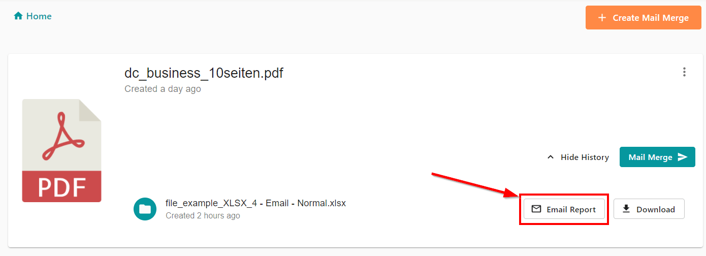 Puede cerrar la ventana del navegador en cualquier momento y consultar el informe de correo electrónico más tarde a través del «Historial»:
