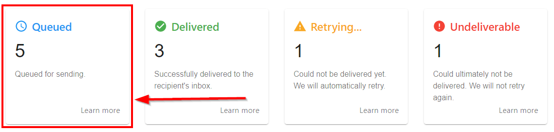 El estado «En cola» significa que el correo electrónico y el archivo PDF adjunto aún tienen que generarse. Procesamos y enviamos todos los correos electrónicos uno tras otro. El procesamiento puede tardar más o menos dependiendo del tamaño del archivo PDF. Tenga en cuenta que este informe solo rastrea al destinatario, no a los destinatarios en CC y CCO.