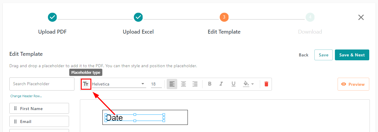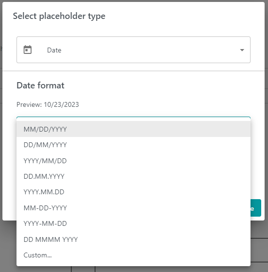 To get a correctly formatted date in the generated PDF file, you can change the placeholder type from Text to Date in MailMergic.