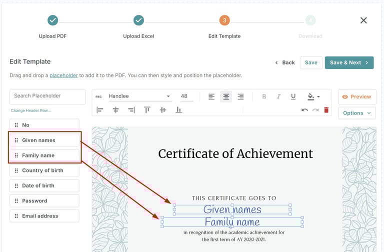 - Arraste e solte marcadores no seu PDF (Passo 3 do assistente): Agora a parte criativa! Dentro do editor de modelos do MailMergic, você verá os marcadores derivados do seu arquivo Excel exemplar. Simplesmente arraste e solte estes marcadores no seu modelo PDF exatamente onde você quer que os dados apareçam. Você tem controle total para estilizar e personalizar estes marcadores, incluindo fonte, tamanho, cor e posição. Além disso, você pode adicionar elementos dinâmicos avançados como imagens, campos para assinaturas eletrônicas ✍️, códigos QR e mais, todos preenchidos pelos seus dados. 🎨