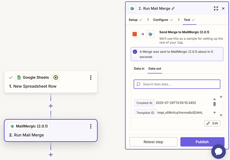 - Teste a etapa: O Zapier permite que você teste cada etapa do seu fluxo de trabalho. Execute um teste para a ação “Executar mala direta” do MailMergic. Isso processará uma linha de amostra da sua planilha do Google e tentará criar um PDF. Verifique os resultados na aba “Dados de saída” para garantir que o arquivo foi gerado corretamente. Se encontrar algum problema, não hesite em entrar em contato com a equipe de suporte do MailMergic para assistência! 🧪